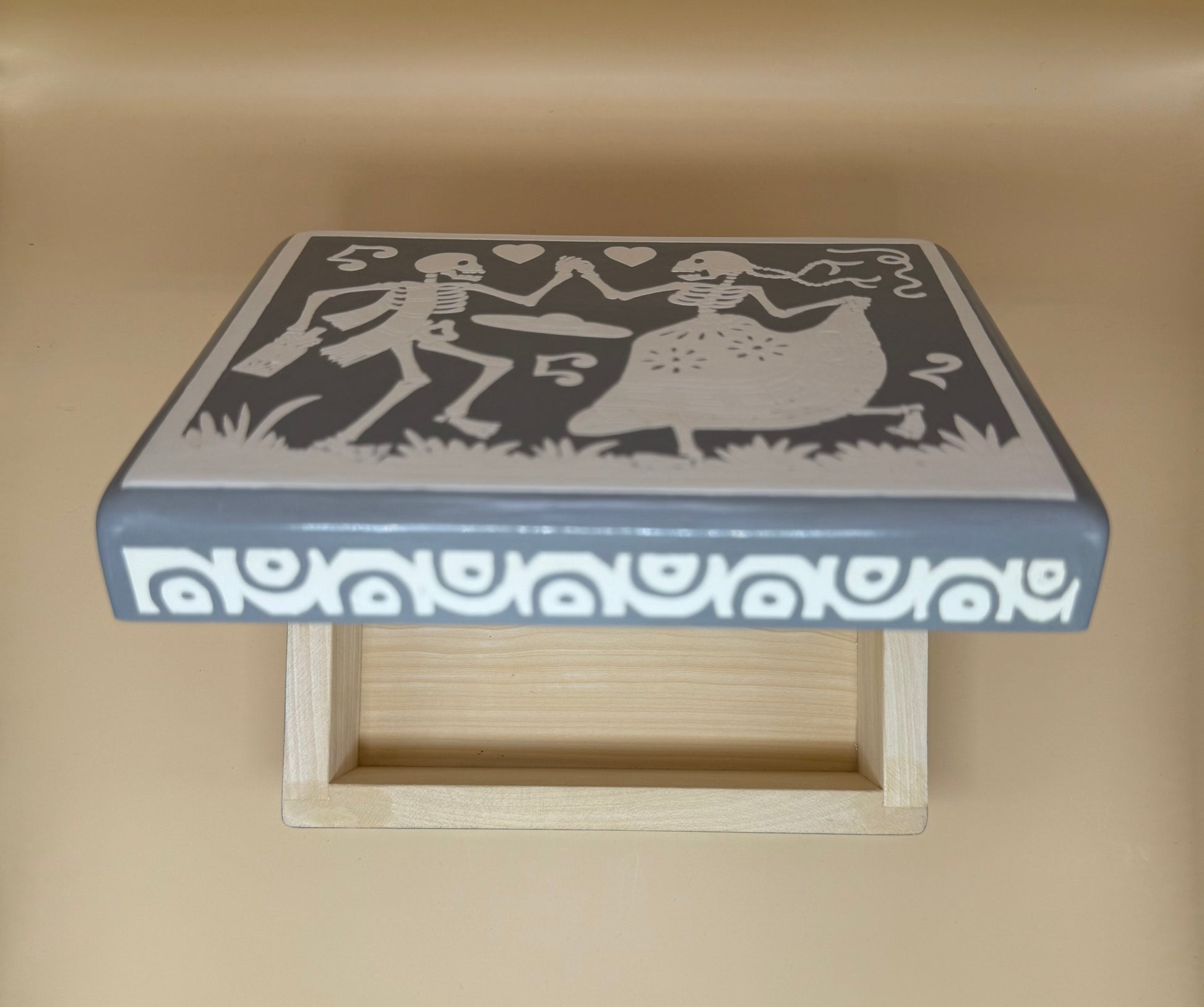 Hecha a mano en Guerrero con la tradicional técnica de laca de Olinalá, esta pieza combina siglos de historia y refinamiento artesanal. Cada caja está elaborada en madera de linaloe aromática, pulida y decorada con motivos de Día de Muertos finamente rayados y pintados a mano con tintes naturales.