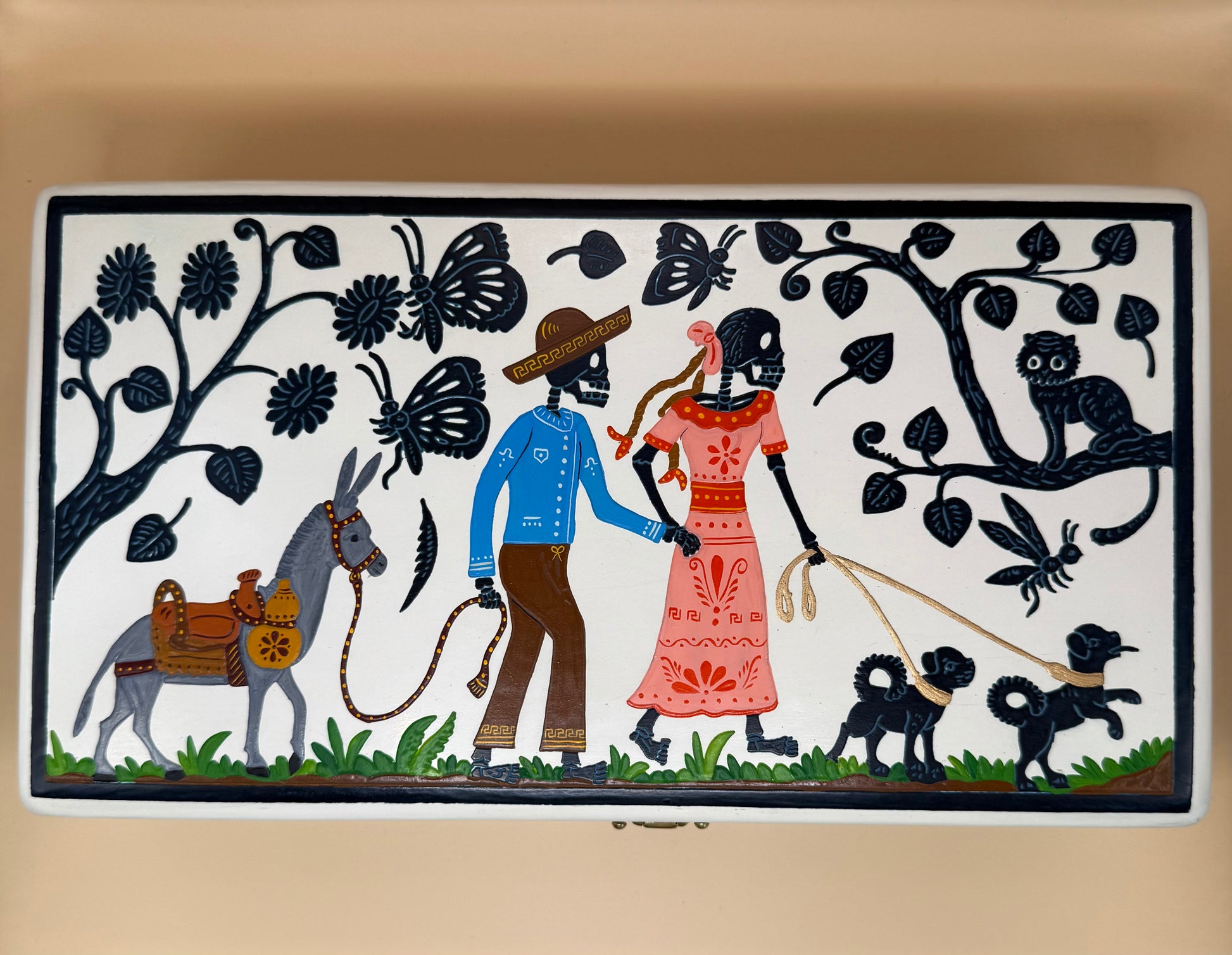 Hecha a mano en Guerrero con la tradicional técnica de laca de Olinalá, esta pieza combina siglos de historia y refinamiento artesanal. Cada caja está elaborada en madera de linaloe aromática, pulida y decorada con motivos de Día de Muertos finamente rayados y pintados a mano con tintes naturales.