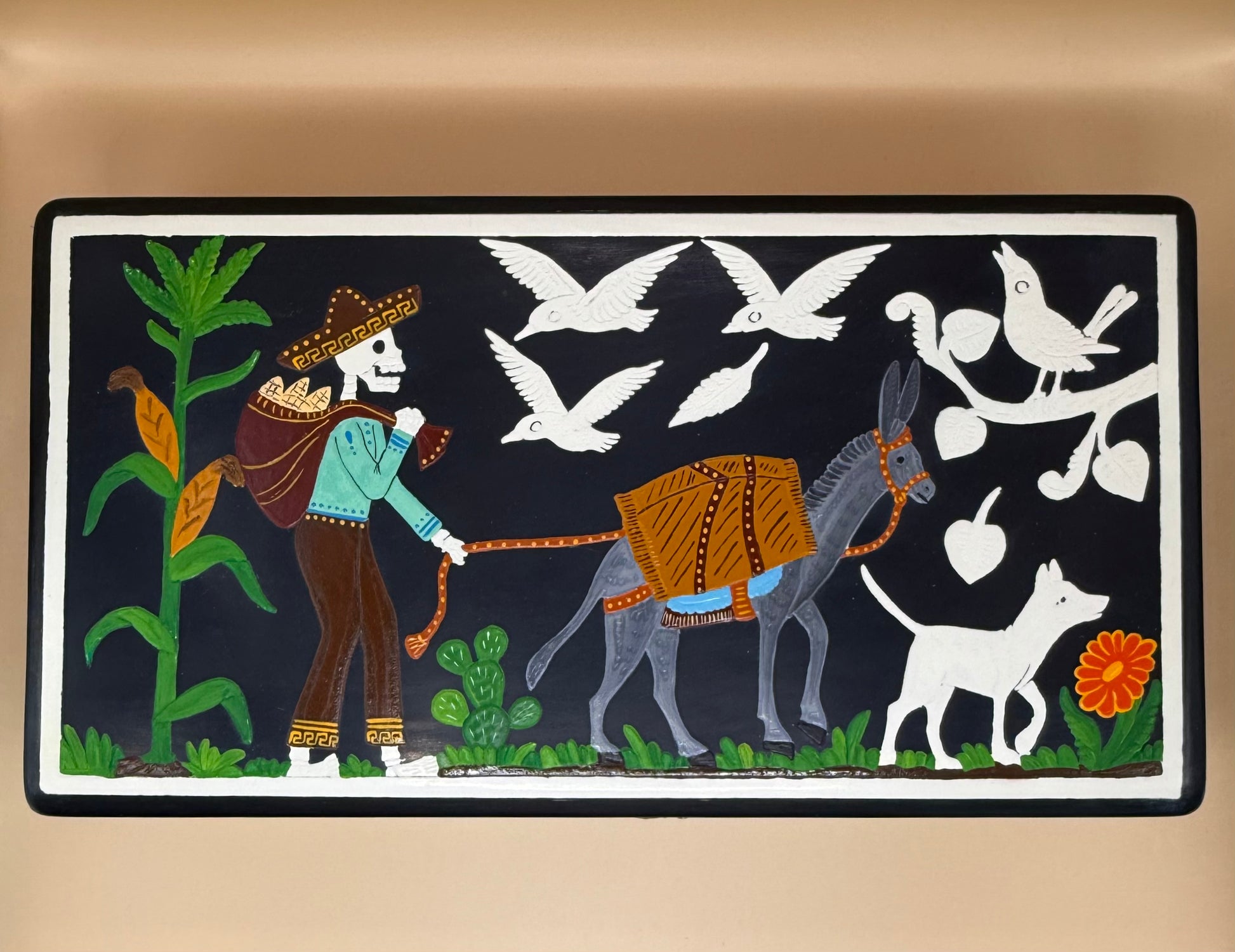 Hecha a mano en Guerrero con la tradicional técnica de laca de Olinalá, esta pieza combina siglos de historia y refinamiento artesanal. Cada caja está elaborada en madera de linaloe aromática, pulida y decorada con motivos de Día de Muertos finamente rayados y pintados a mano con tintes naturales.